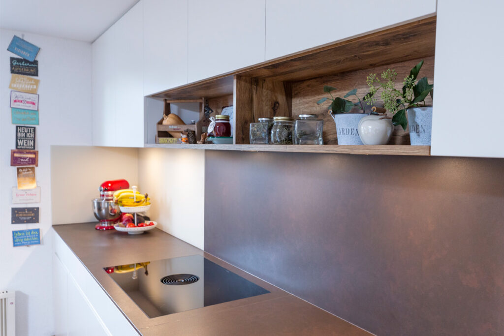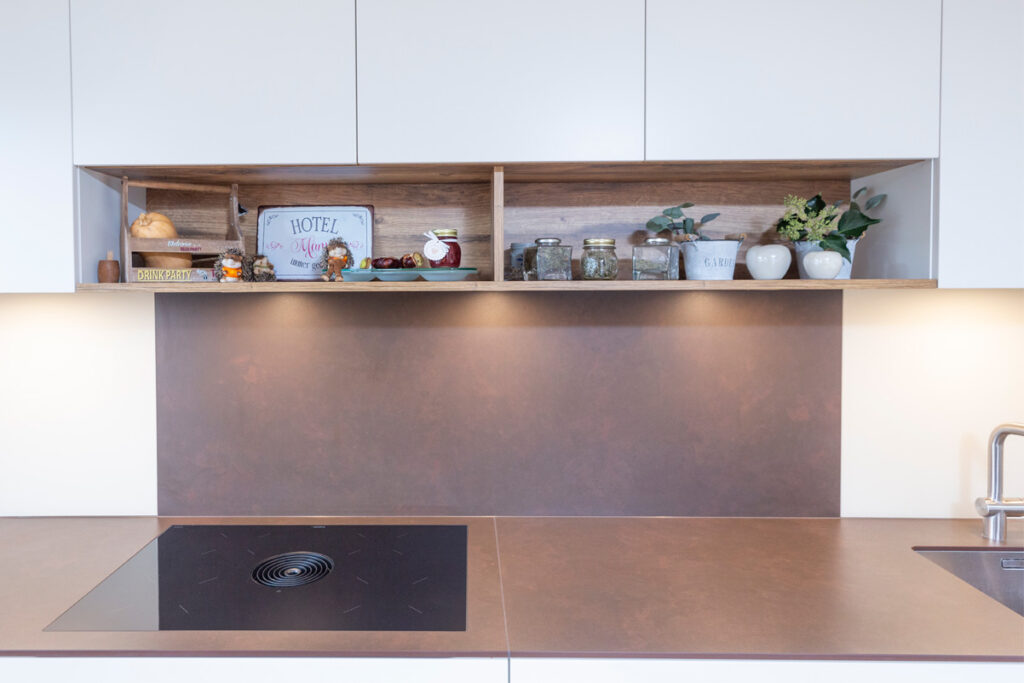 Küche mit zweifarbiger Rückwand. Offenes Gestell in Oberbauten integriert.