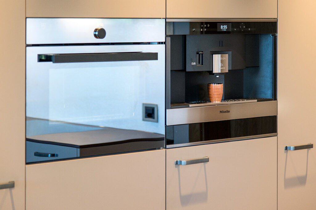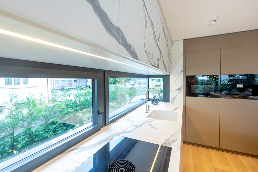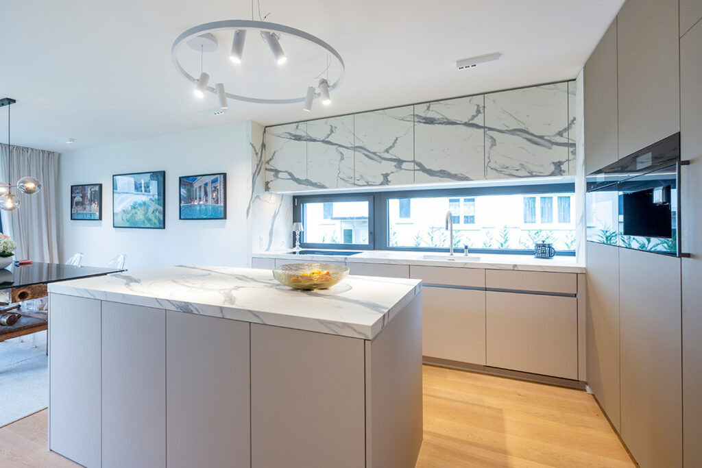 Küche in supermatter Ausführung, Frontfarbe Samit. Abdeckung Dekton.