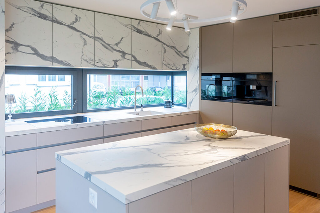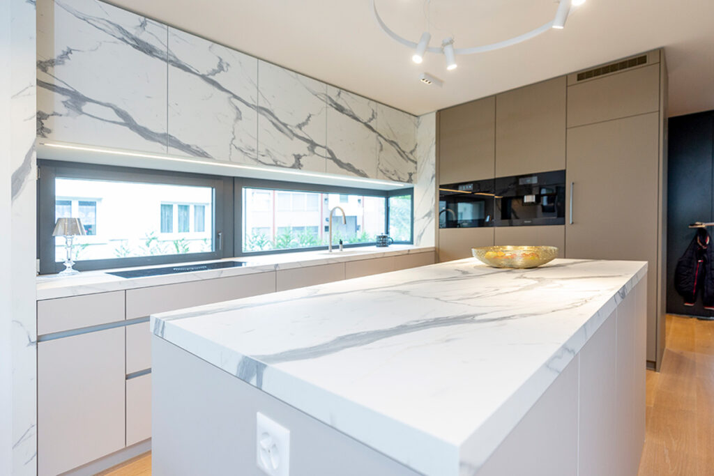 Küche mit keramischer Abdeckung und Marmorimitation 50 mm dick.