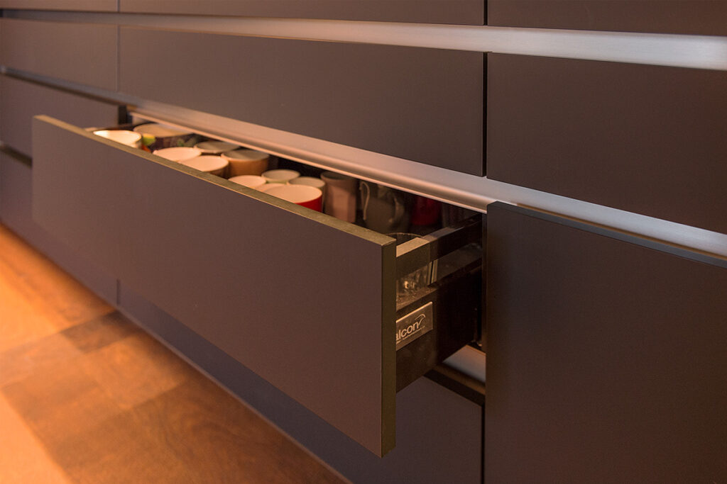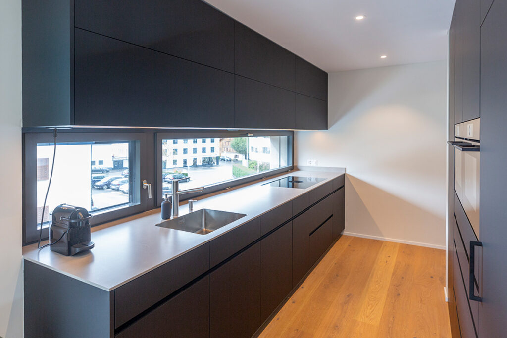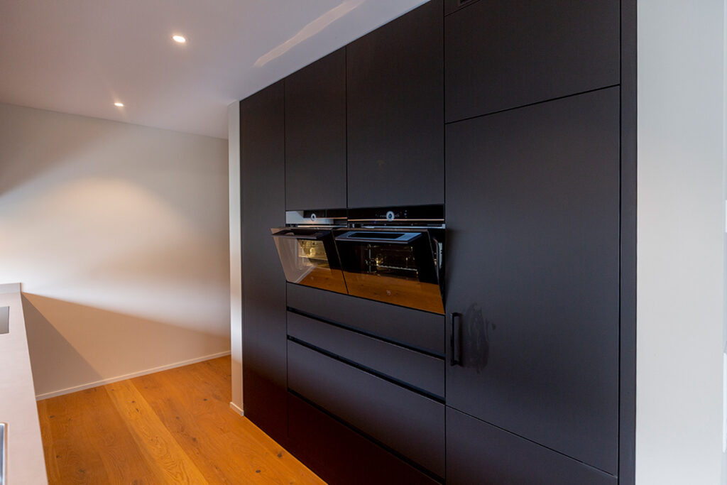 Küche in supermatter Ausführung, Frontfarbe schwarz Damast.