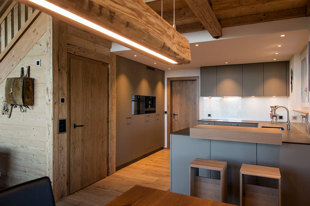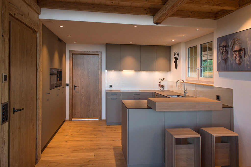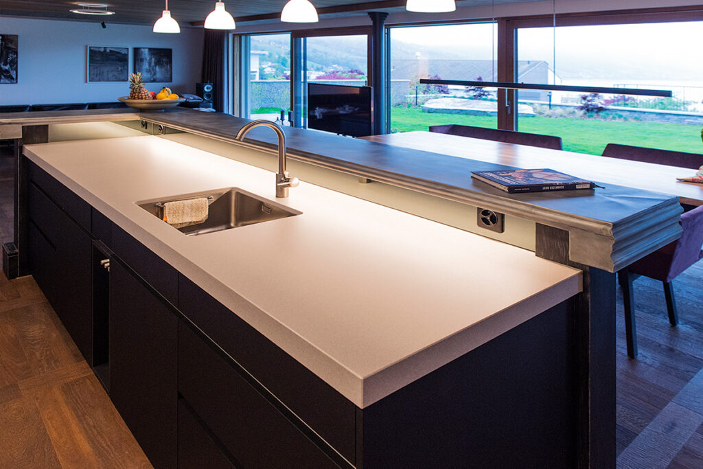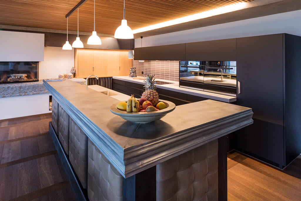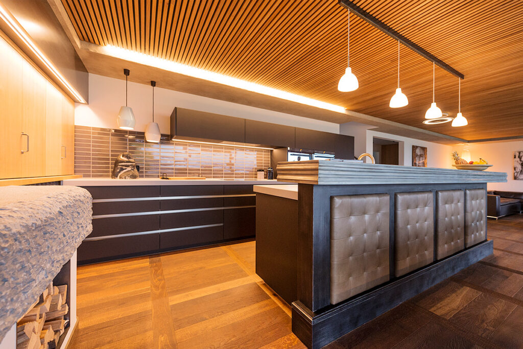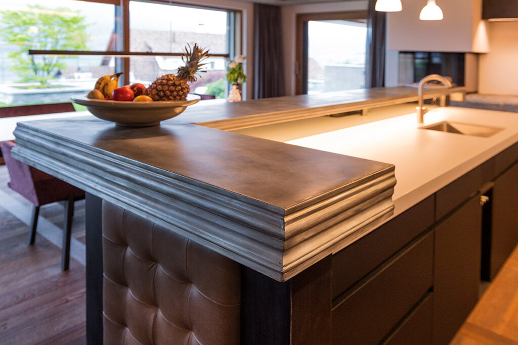 Küche mit Barabdeckung in Zinkblech. Barverkleidung vorne in Leder.